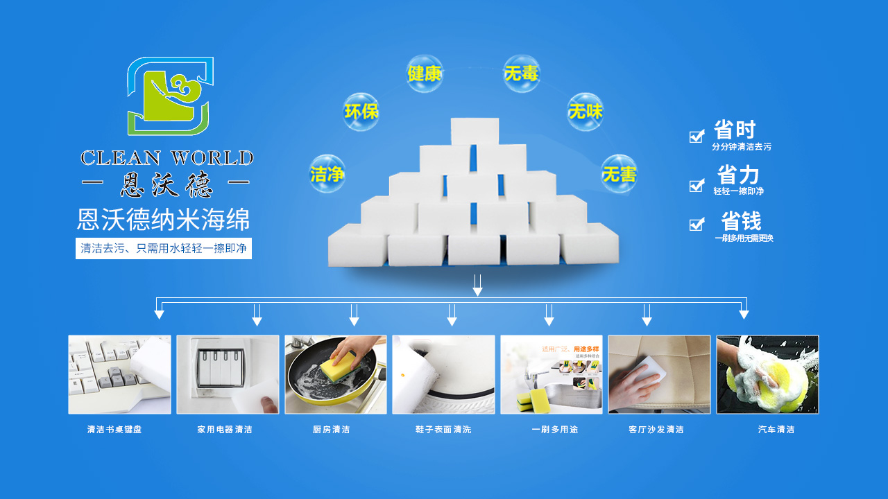 納米海綿是一種有高開孔率的三維網(wǎng)格結(jié)構(gòu)的新型泡沫塑料,采用物理去污的機(jī)理,依靠納米海綿特殊三維網(wǎng)狀結(jié)構(gòu)(每個小顆粒比頭發(fā)絲的萬分之一還?。⑵浣窈?,其內(nèi)部就會形成無數(shù)個納米級毛細(xì)管開孔結(jié)構(gòu),在抹拭過程自動吸附物體表面的污漬。所以這些海綿塊只需要加一點(diǎn)水,就變成清潔力強(qiáng)的產(chǎn)品,可以擦拭頑固的污漬,也不用擔(dān)心會有刺激性化學(xué)物質(zhì)。納米海綿可以用于家中的大多數(shù)物品的表面,從油煙機(jī)到灶臺、墻壁上的畫畫印記、浴室里的水漬水垢、浴缸污垢、茶杯里的茶漬、墻壁劃痕等通常難以擦洗的表面。